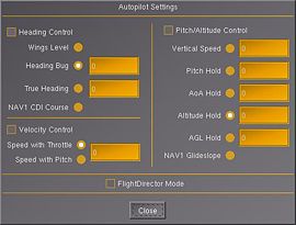 Some aircraft in ProFlight however only provide one means of interacting with the autopilot (i.e. autopilot dialog or panel hotspots). For example, the Seneca II and the Piper Comanche autopilots can be only used from the virtual cockpit using custom panel hotspots. In general, it can be considered to be more complex to provide proper cockpit panel implementations than wiring up the autopilot properties to the standard autopilot GUI dialog, so if an aircraft's autopilot doesn't seem to work properly using cockpit panel hotspots, you may want to try using the standard GUI dialog instead. Also, please note that not all aircraft/autopilot combinations provide full support for all features offered by the standard autopilot dialog. This may be due to an aircraft's completion status, but also due to technical limitations in certain aircraft/autopilot, so that only certain modes are provided. This may also apply to aircraft panels, that are seemingly offering functionality that may not yet be implemented. Autopilot SettingsThe AP Settings dialog can be found at Autopilot > Autopilot Settings. Heading control