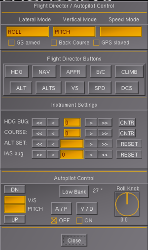 Autopilot in ProFlightWe have a generic one and custom ones written for a certain aircraft, which are supposed to simulate particular autopilot types/models for a specific aircraft. The generic one can be used for aircraft which don't have a custom autopilot implementation, and seems to work reasonably well on most aircraft using JSBSim. You can enable it with the "Autopilot Settings" which you can open using the F11-key or in the menu bar using the "Autopilot" item. In real life, aircraft have specifically-programmed/customized autopilot system to cater for individual aircraft characteristics. To a certain extent, ProFlight has the possibility to simulate this as well. So it is possible to write a custom autopilot.xml to override the generic autopilot implementation. This custom autopilot configuration file can be driven by either the standard autopilot dialog, custom cockpit panel hotspots or a combination of both. Also, it is possible to provide enhanced or completely new implementations of the standard autopilot dialog to cater for autopilot/aircraft-specific features (for examples, see the b1900d or Citation Bravo in Git/HEAD).